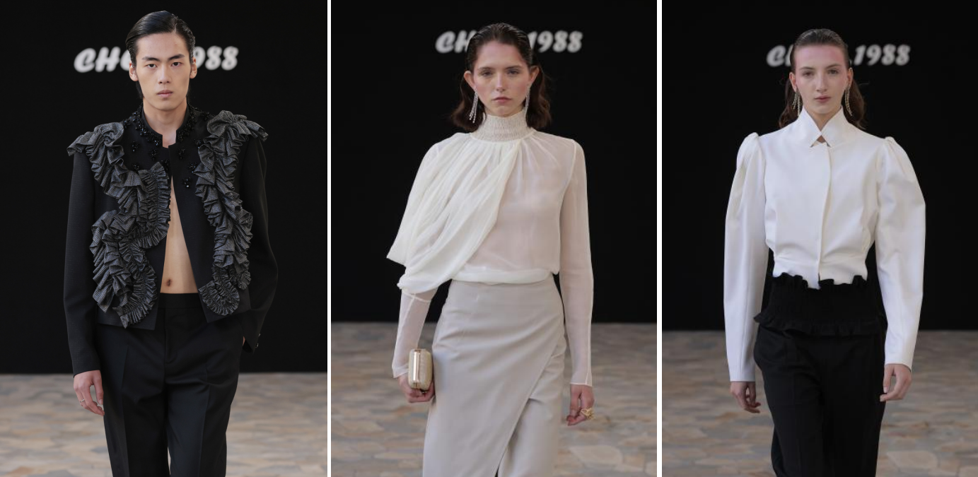 As the bell tower's chimes swept over the dark rooftops, the "Autumn Ideal" showcase by Chen Long, a recent "Golden Crown Award" winner, commenced romantically. The corridor's floor tiles reflected the twilight and stage lights, intertwining with the gradient pink hues on the models' skirts. Hand-beaded bows trembled gently with each step, while the three-dimensional textures crafted from lace and laser-cut details played with light and shadow among the pillars. The sharp silhouettes of shoulder designs echoed the classical lines of the distant clock tower. Using ‘autumn’ as his poem, Chen Long transcended mere representation, employing the clash of soft pink and charcoal grey, and the interplay of delicate gauze and sharp cut-outs to outline the serene yet rich inner world of women through the cadence of the walk.Gather details on sheer necklines broke the boundaries of traditional elegance, and puffed skirts merged with contemporary silhouettes, conveying a relaxed and confident Eastern aesthetic attitude with each step, exuding both ease and vibrant design tension, showcasing the unique charm of contemporary Chinese design.