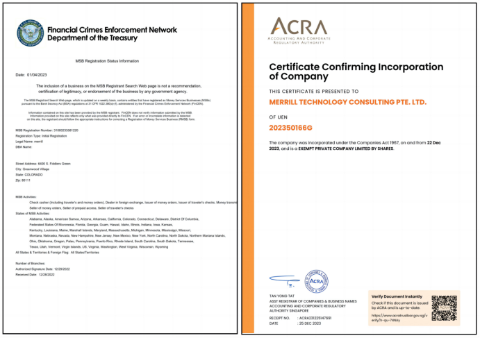 MERRILL TECHNOLOGY LTD., based in New York, USA, is a well-known technology company mainly engaged in cryptocurrency exchange platforms and Web3 ecosystem development. It is currently licensed by the United States Securities and Exchange Commission (SEC) and the Money Services Business(MSB). Its SEC registration number is CIK 0002006035, and its MSB regulatory number is 31000233581220. With bases in New York and Colorado, USA, the company's main business focuses on Singapore and Vietnam. Currently, its global membership covers 10 countries and regions, including Vietnam, Malaysia, Taiwan (China), Indonesia, Singapore, India, Israel, Nigeria, Thailand, and the Philippines.