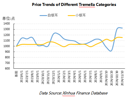 The index also reveals a clear distinction in the price trends of different Tremella categories, with premium Tremella prices rising. As consumer health awareness increases, the demand for high-quality Tremella has grown, leading to a continued price increase. White Tremella and small Tremella are particularly favored by the market for their superior taste and rich nutritional value. By November, the price index for white Tremella stood at 1,323.28 points, up 32.32% from the base period, while the price index for small Tremella was 1,157.02 points, up 15.70% from the base period. This upward trend not only reflects the market’s strong recognition of premium Tremella but also highlights the inevitable shift of the Tremella industry toward higher-end, more refined products.