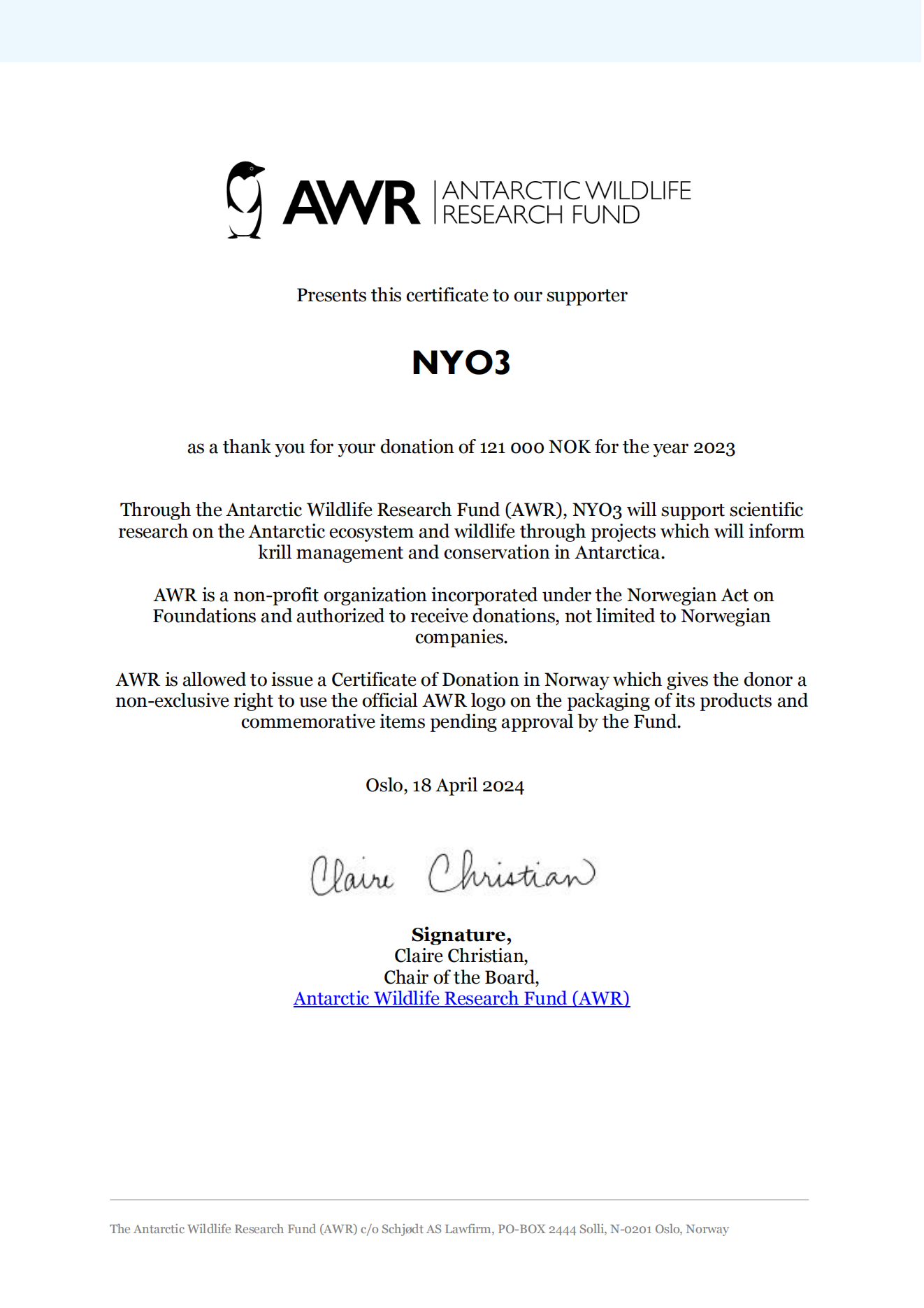 AWR is an integral part of NYO3's commitment to sustainable development and responsible production and operation of krill for global consumers. Roger Kristensen, the Honorary Chairman of NYO3, stressed: "AWR provides an opportunity to continue monitoring the impacts of krill fishing and conducting further ecological research on this important species, and we hope that through our contribution to the Fund, we will support sustainable research and management in Antarctica to maintain a healthy ecosystem for krill and all Antarctic species that depend on it as well."