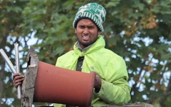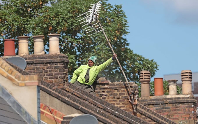 The man holds a chimney pot as he stands on the roof