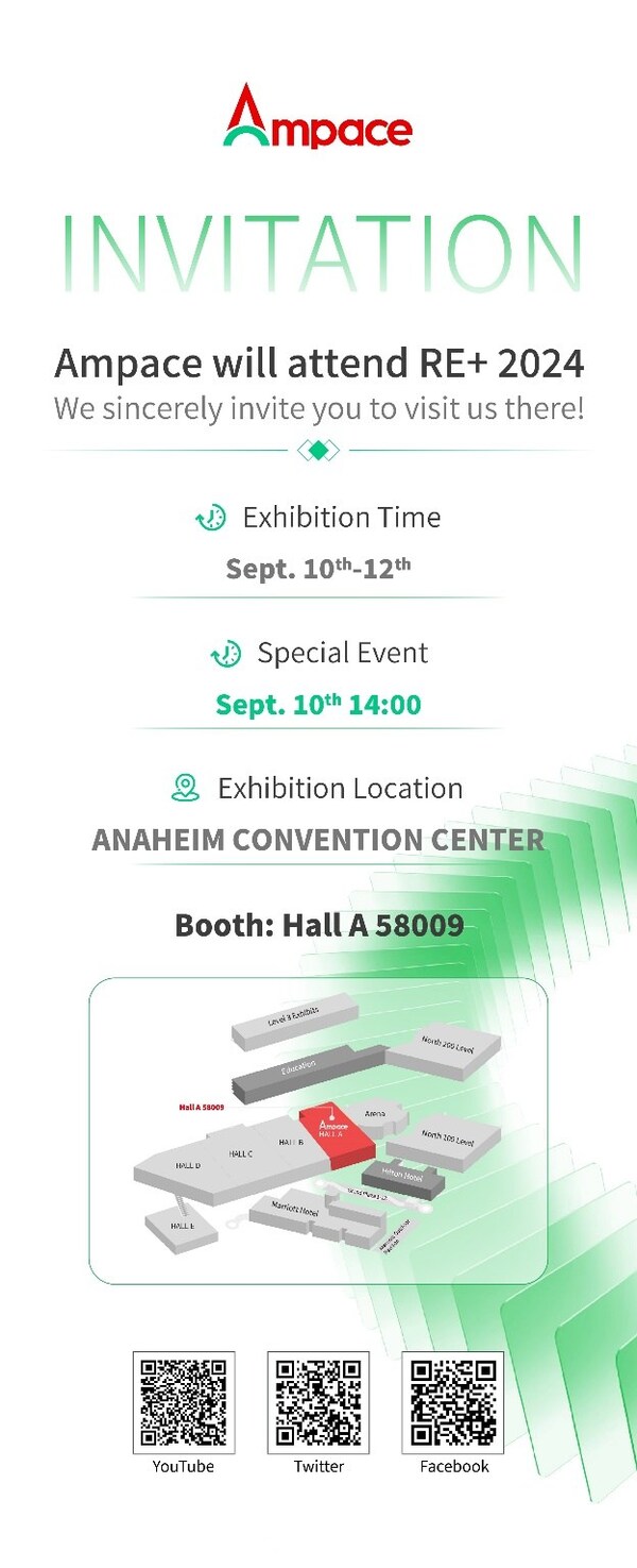 Ampace,with technology-driven at its core,is always dedicated to providing innovative energy storage solutions that are "ultimate safe,ultimate reliable,ultimate performant,and ultimate experiential." Looking forward to Ampace showcasing its star product,the UniC series,at RE+2024 (Booth Number: 58009).
