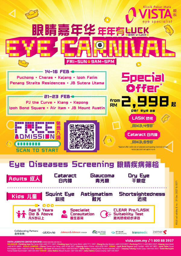 PETALING JAYA,Malaysia,Feb. 14,2025 -- As people live longer,ensuring a purposeful and fulfilling life becomes even more important.Life expectancy in Malaysia has steadily increased to 76.26 years ([1]),highlighting the growing need for proactive healthcare. Clear vision is crucial for maintaining independence,quality of life,and achieving personal aspirations. In response,VISTA Eye Specialist (VISTA) proudly presents the VISTA CNY Eye Carnival—a nationwide initiative to raise awareness about preventable blindness and the importance of regular eye screenings.