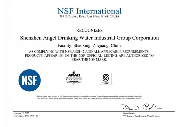 As global consumers become increasingly concerned about safe and healthy drinking water,the market demand for water purification solutions is surging rapidly. At this backdrop,ANGEL's NSF certification demonstrates its top-tier product quality,and enhances the competitiveness in the global market. ANGEL will persist in driving technological innovation and advancing its global expansion,harnessing its expertise to provide superior,efficient,and intelligent water purification solutions for consumers worldwide.
