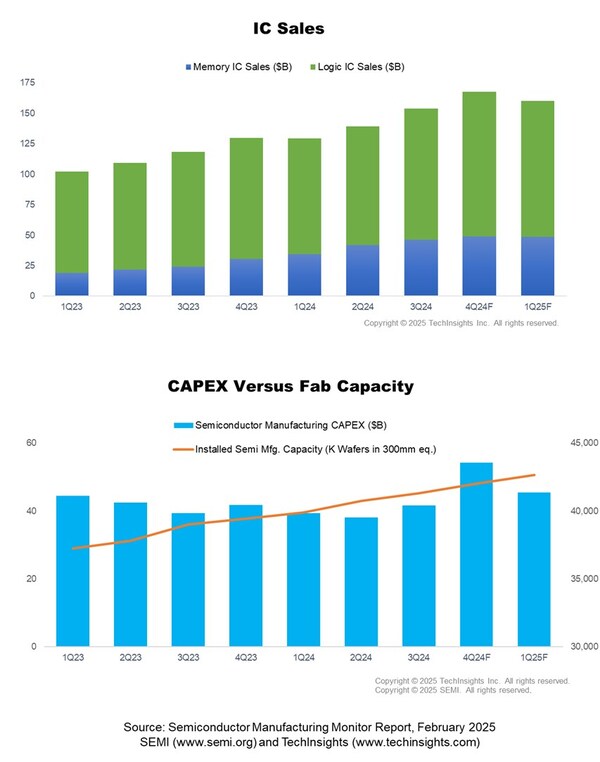 In Q4 2024,installed wafer fab capacity surpassed a record 42 million wafers per quarter worldwide (in 300mm wafer equivalent),and capacity is projected to reach nearly 42.7 million in Q1 2025. Foundry and Logic-related capacity continues to show stronger increases,growing 2.3% QoQ in Q4 2024,and the segment is projected to rise 2.1% in Q1 2025 driven by capacity expansion for advanced nodes. Memory capacity increased 1.1% in Q4 2024 and is forecasted to remain at the same level in Q1 2025 driven by strong demand for HBM.