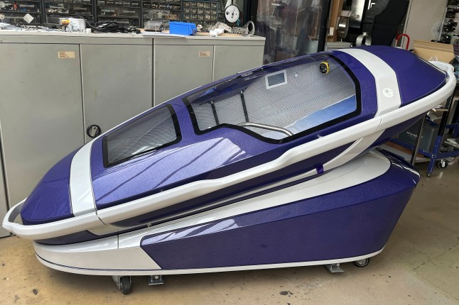 A ‘suicide pod’ known as ‘The Sarco’ is seen in Rotterdam,Netherlands,last year (Picture: AP)
